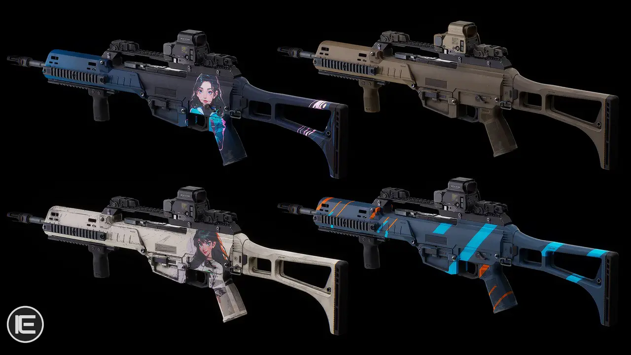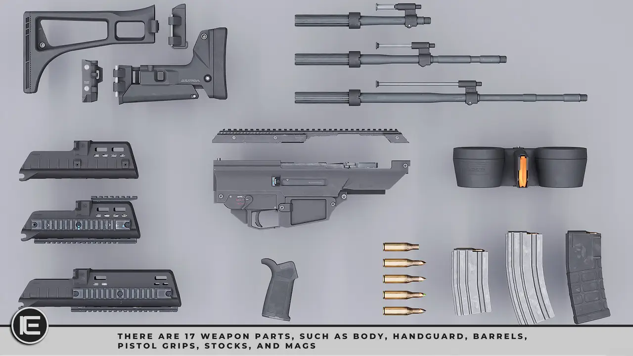In addition to the advanced modular system and over 48 unique parts, you also get 7 pre-defined 5E platform versions! These traditional variants range from ‘barebone’ models to ‘fully equipped’ rifles, totaling 30 optimized skeletal meshes to save you time.