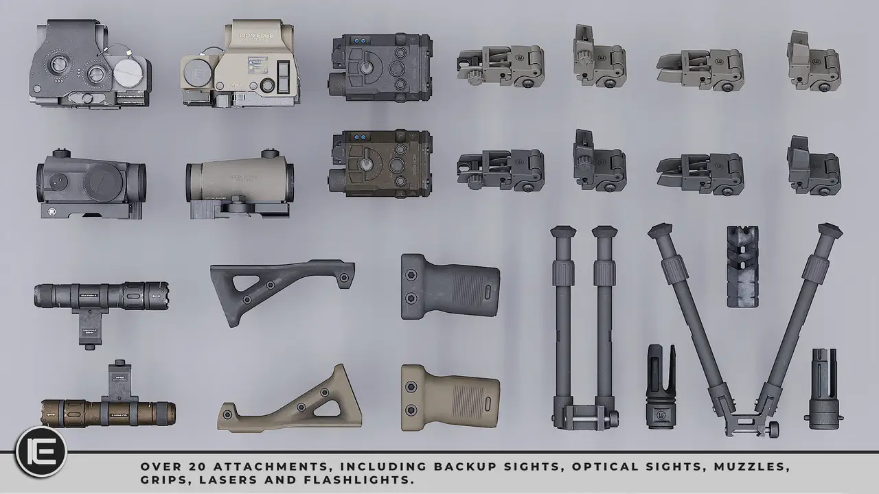 You are viewing a collection from the 5E platform by Iron Edge, designed for developers looking to implement advanced customizations in their games, similar to titles like Call of Duty and Escape from Tarkov. At Iron Edge, we use real firearms as a reference to create authentic and realistic models, ensuring high fidelity and immersion in every detail.